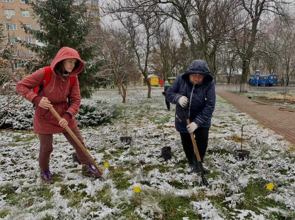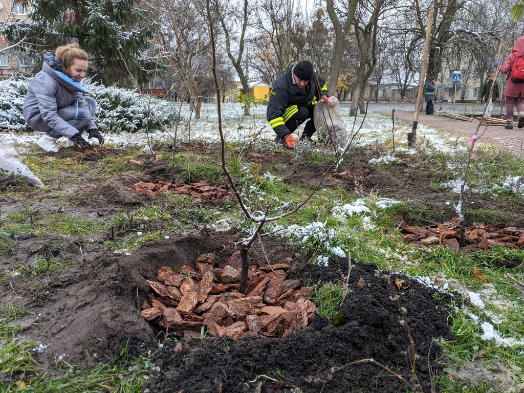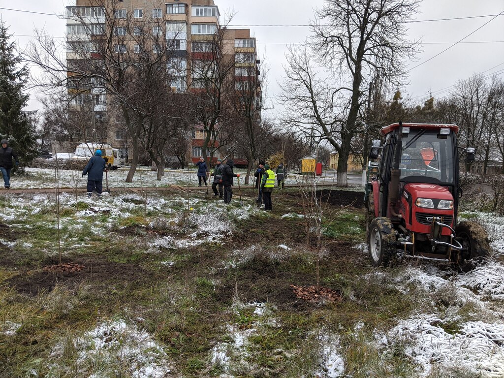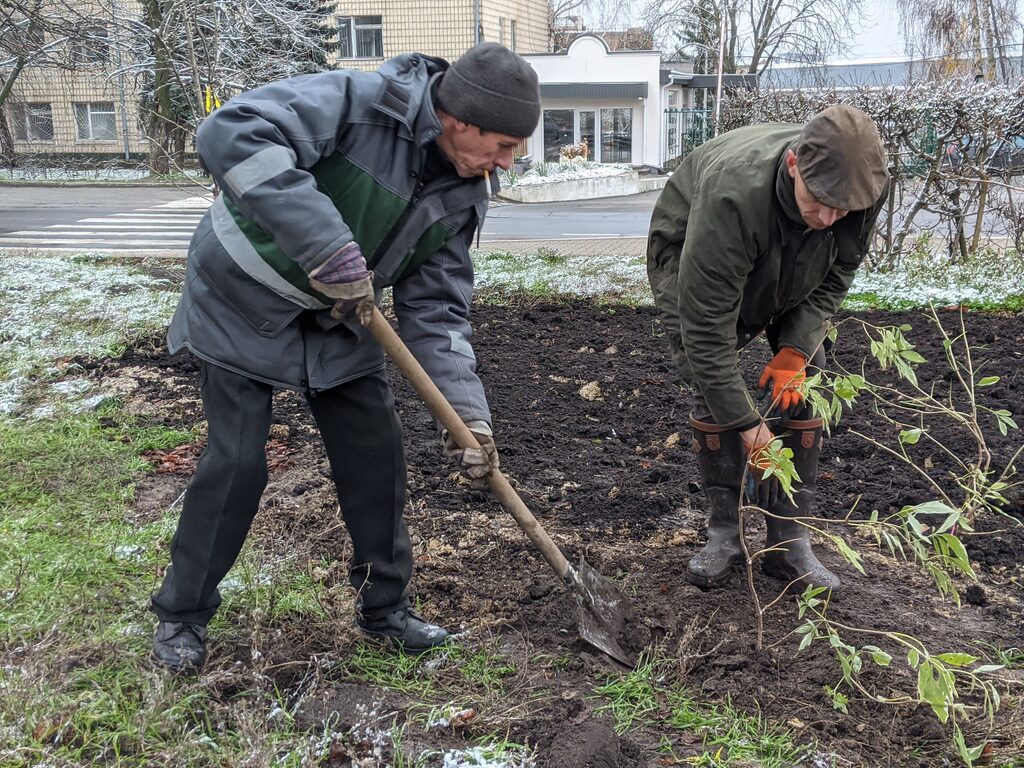 Біля будинку Культури на вулиці Яблунській сьогодні дружньо садили нові дерева і кущі, які навесні подарують місцевим жителям затишок і яскраві кольори різнобарвних квіток. Адже нові бузки із незвичною колористикою: блакитні і жовті, білі, бузкові, лососеві, рожеві. А поруч додали ще й японську айву і півонію, які теж радують око під час цвітіння.