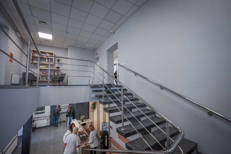 Увесь простір відповідає нормам інклюзивності: широкі дверні отвори, відсутність порогів та будь-яких бар’єрів. Упорядкована і прилегла територія — доріжки, лавки, парковка, зелена зона та інклюзивний дитячий майданчик.